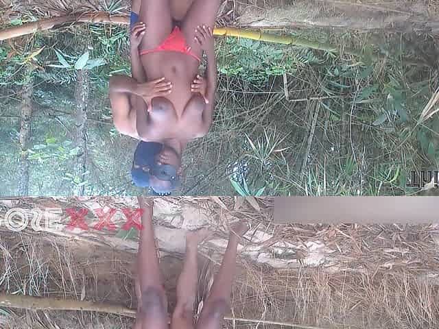 Cute breasty skinny black angel touching rod in the wild