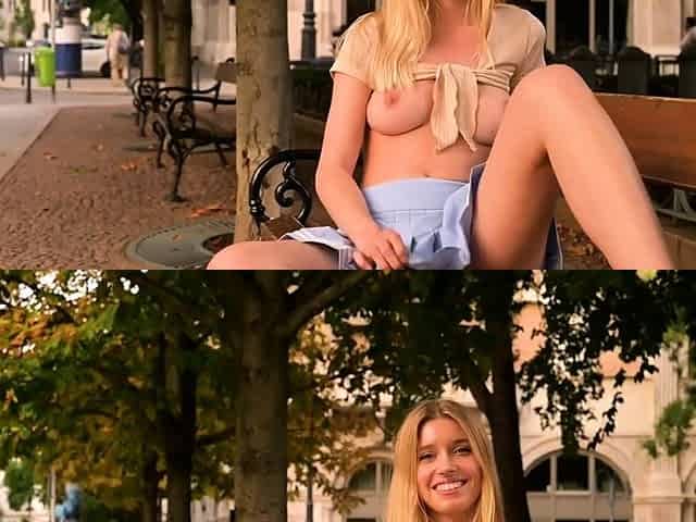 Blonde is flashing her big boobs in the outdoors