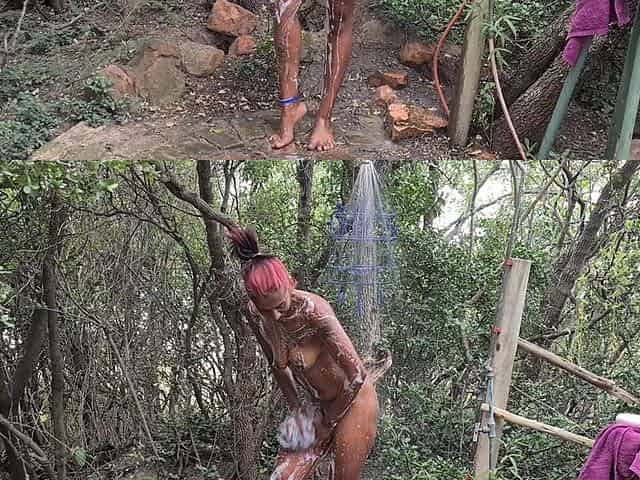 Dark Tattooed Desi Slut Taking a Shower in the Woods at a Nude Resort