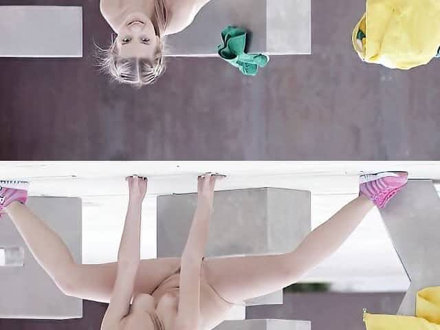 Nudist maid cleans the yoga room. A naked cleaner cleans mirrors, sweeps and mops the floor. 2