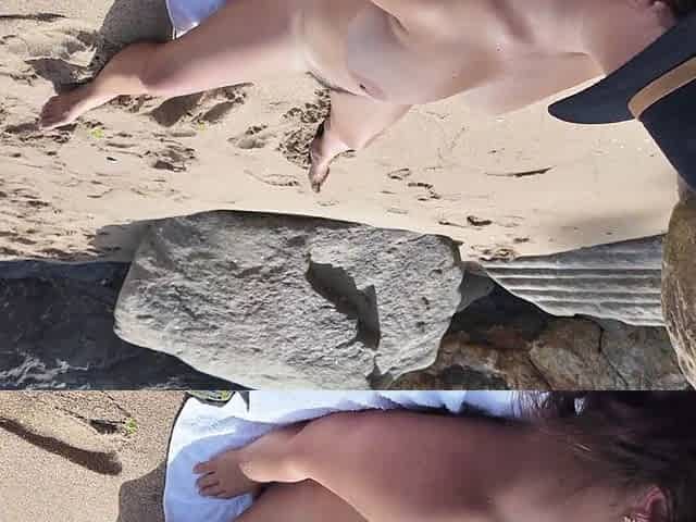 Wife chilling out at the naked beach speads her legs.