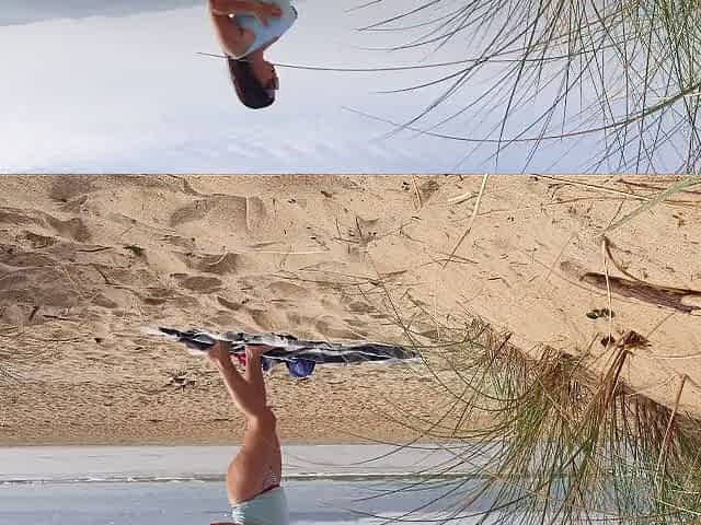Topless sunbathing on a towel on a public beach, flashing my breasts