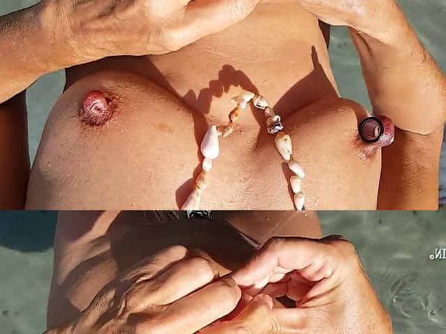 nippleringlover undressed beach tunnels in pierced teats stretching pierced cunt wide open for peeing