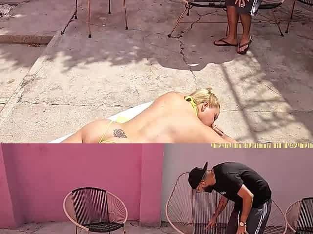 "Mel strips on the balcony in front of people"