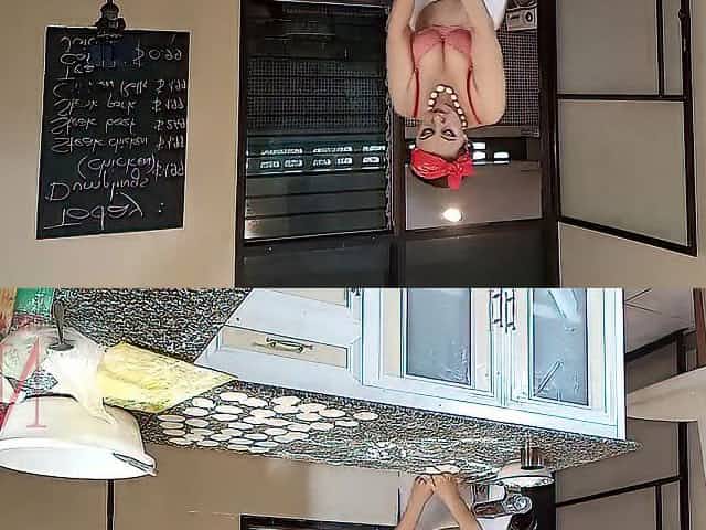 A stripped housewife is preparing dinner in the kitchen. The immoral whimsical housekeeper Brassiere