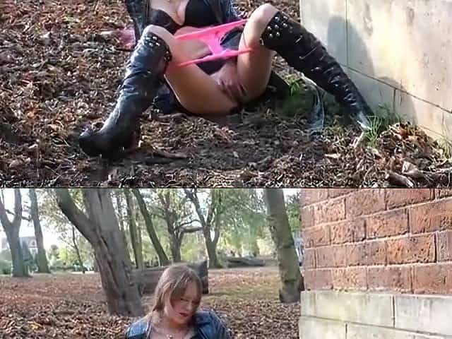 mature masturbating both holes outdoor