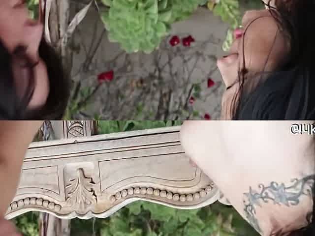 Two Tattooed Women Do Erotic And Sloppy Kissing Outside