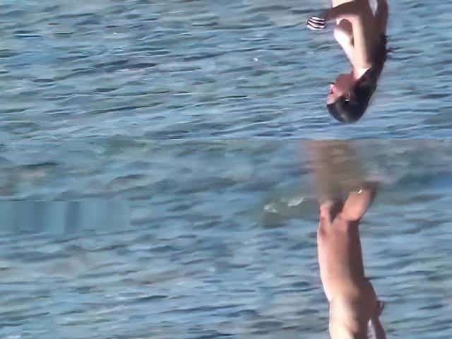 Beach spy cam catches a nudist girl running into the water