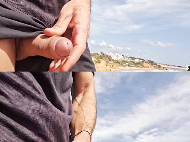 Showing off and wanking my large hard rod on a stripped beach - Eumesex