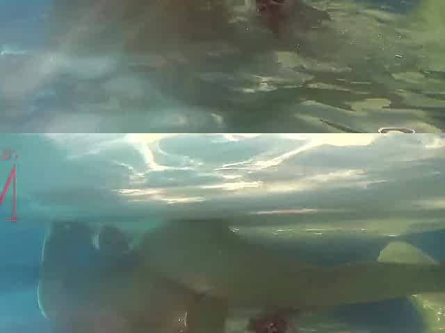 Elegant and supple playgirl, swimming underwater in the outdoor swimming pool. three two