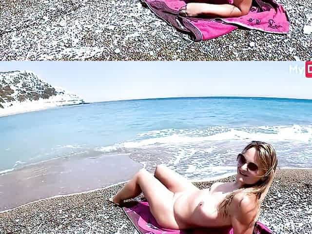 Curvy Nudist and on the Beach. Funny Dildo! "bye Bye!"