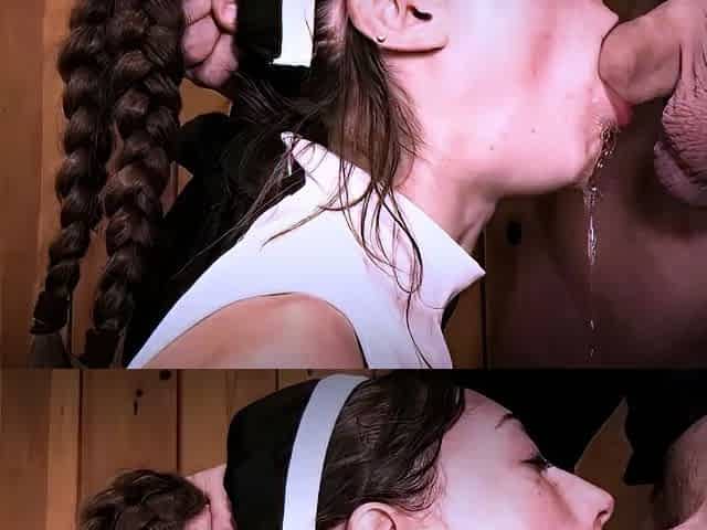 Nun cosplay slut depptroating his cock and drooling on his balls