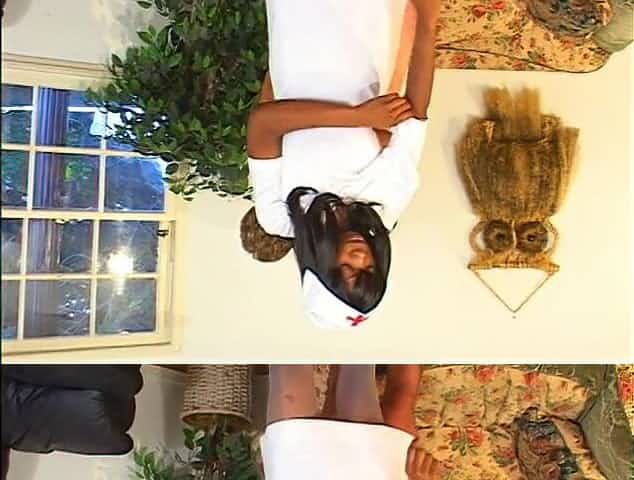 Sexy ebony nurse in nylons gets pounded and creamed by a white chap in couch