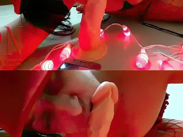 Woman in red mesh nylons gets a large sex toy in her vagina Regina Noir