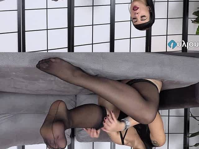 Super Sexy Dark Haired Babe Daphne Posing Her Beautiful Feet in Her Tight Pantyhose
