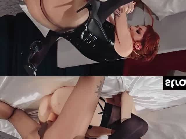 Nylon Clad Redhead Takes Her Hot Girlfriends Strapless Dick