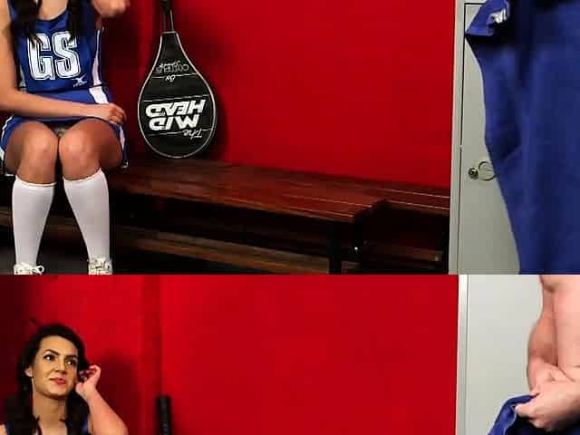 Brunette hair t-girl in ebony fishnet nylons bangs a stud