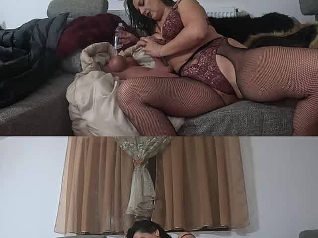 Beautiful brunette milf in lingerie, pussy licking and toy play.