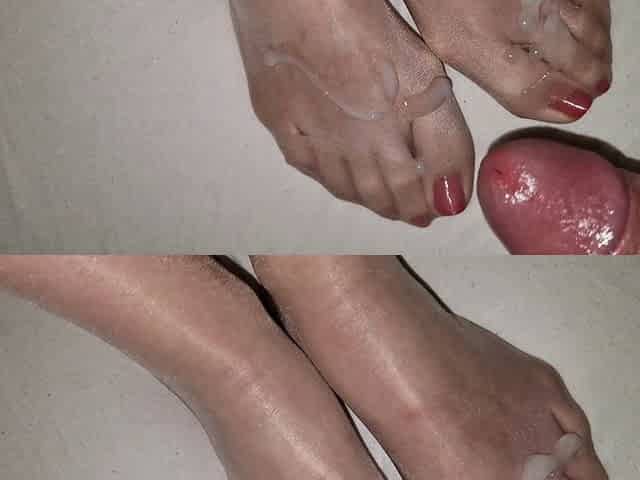 Cum on my perfect wife's brown nylon feet with a crimson pedicure