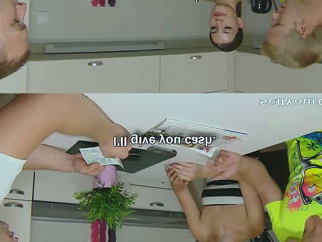 Svelte brunette nympho takes one dick in her butthole and the other in mouth