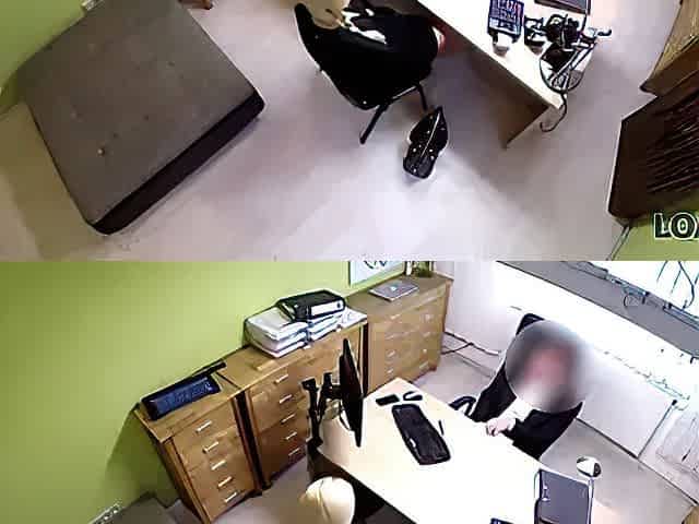 Security guard hammering sexy coed on his office desk