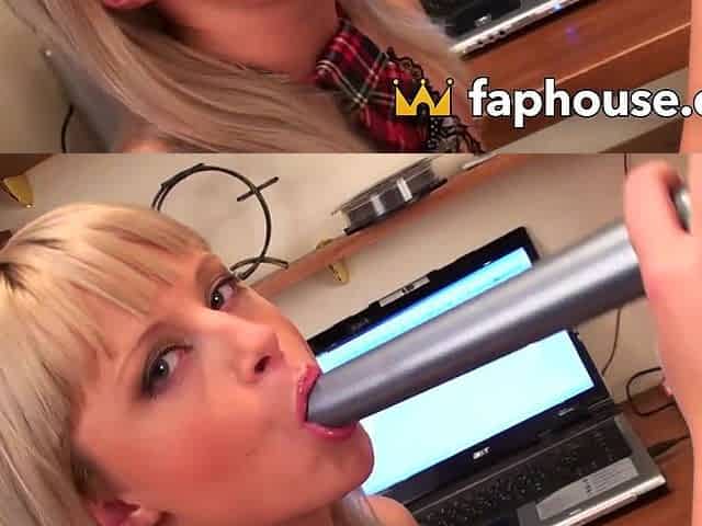 Blonde office slut gets edged by boss with a thick sex toy
