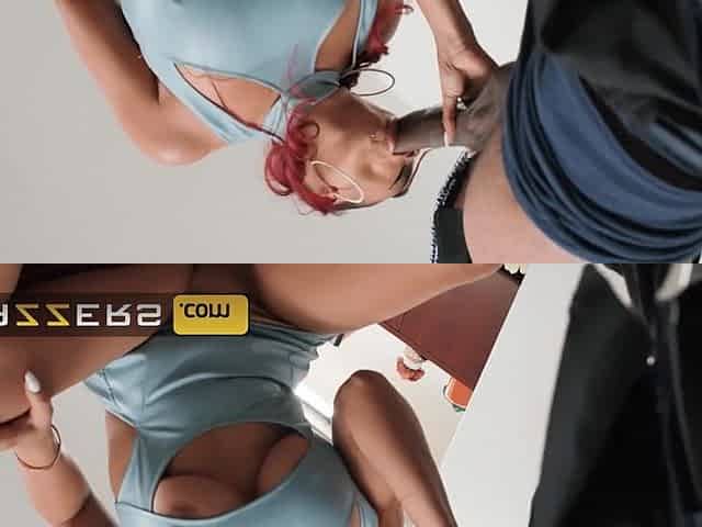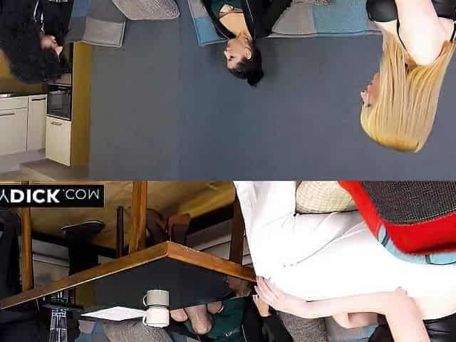Nerdy CFNM blonde blowing cock at the job talk