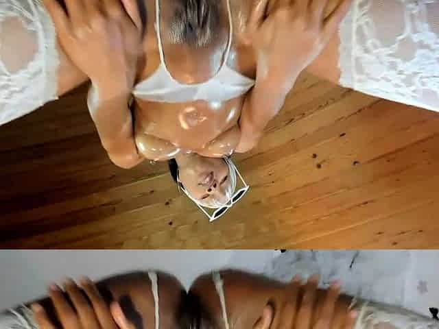 Breasty Bimbo Bitch Oils Herself Up And Jumps On Rod