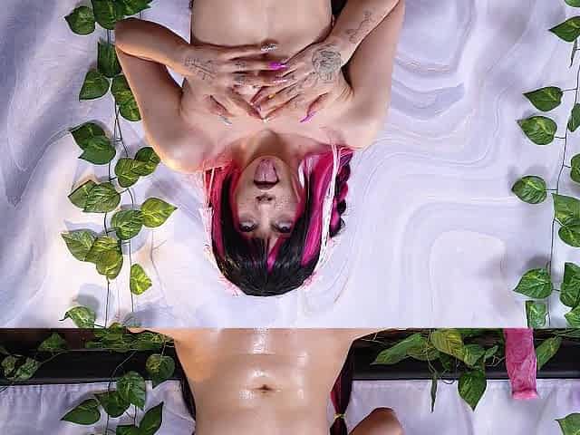 PINK HAIRED ANGEL PUTTING FINGERS INTO OIL-FULL VAGINA AND SCREWING HER SMOOTHY BUTT