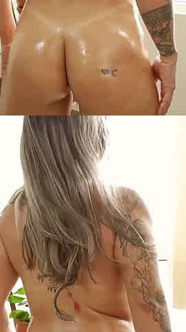 Oiled Tattoo Babe Reverse Rides to Orgasm