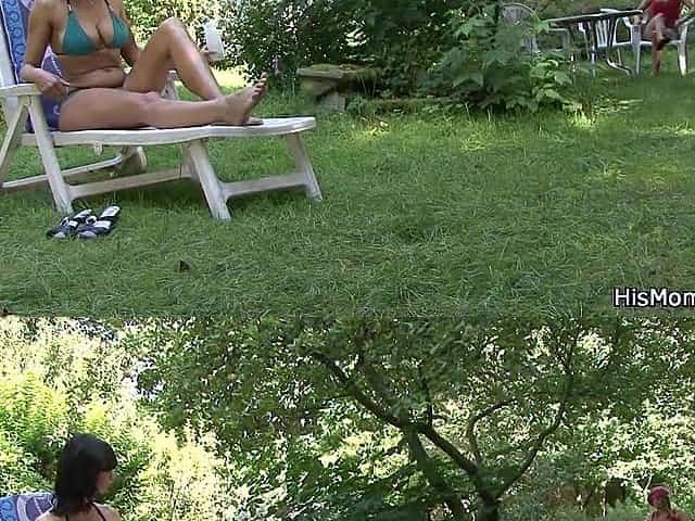 Horny mom toying his gf outdoors