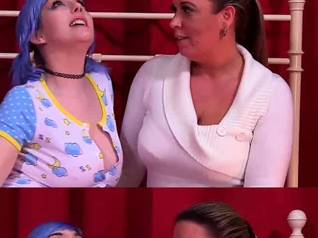 Busty lesbian milf pussy licking petite brunette babysitter