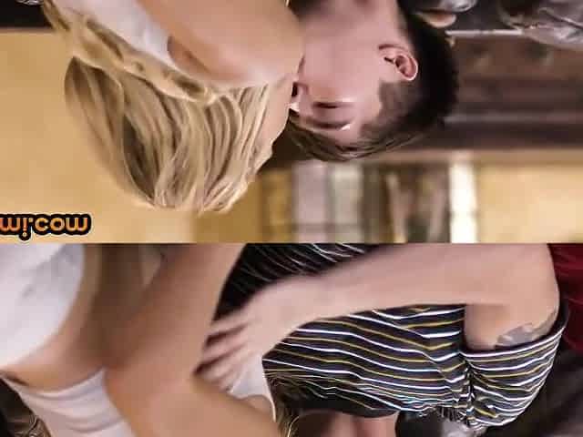 Skinny golden-haired woman with petite tits is having casual sex with her step- son, on the bed