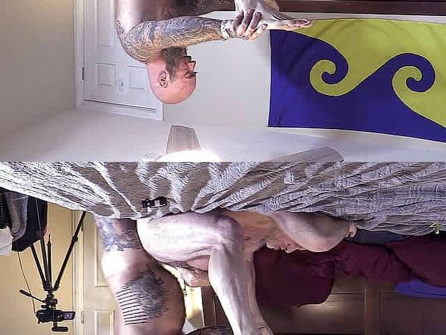 Mike rides a huge black dildo whilst wanking his big uncut cock