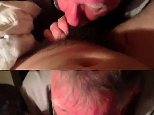 Chunky older daddy gives a younger dude a hot blowjob and rim job