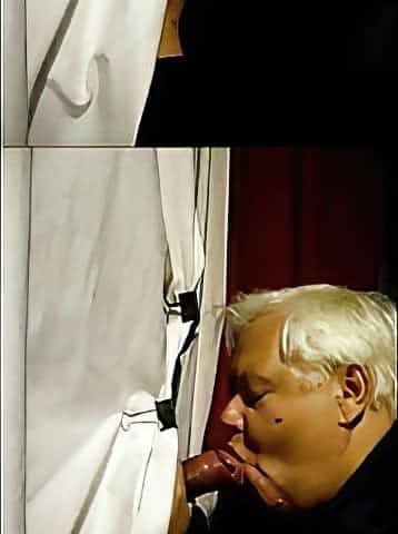 Old man sucking cock in a makeshift gloryhole