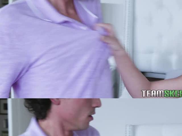 Zealous brunette Leanne Lace seduces handsome tutor and rides him on top