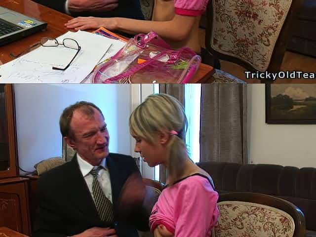 Lusty and slutty blond haired skinny chick rides older man's dick on top