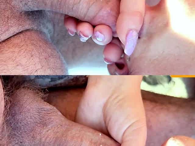 Real wife climax after masturbation and tugjob. Sexy jizz on twat