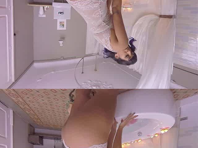 A brunette hair washes and then cums in the baths. A bushy snatch masturbates.