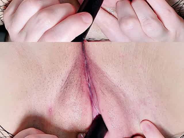 Bad chick drilled herself with a large sex toy. Angel in lace underware plays with a rod.