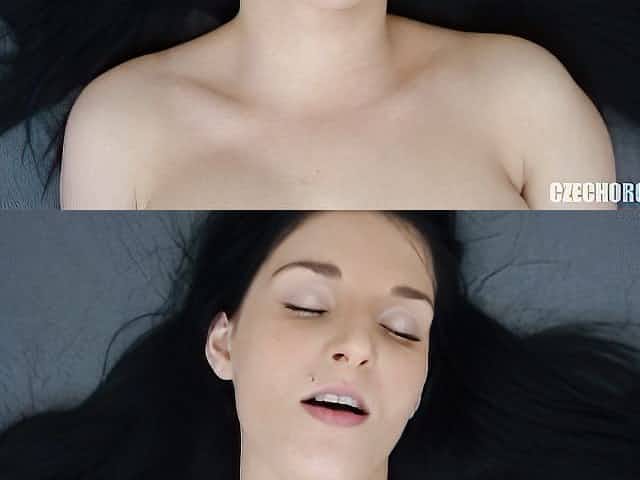 Cute black-haired Roxie Bree smiles during the hardcore masturbation