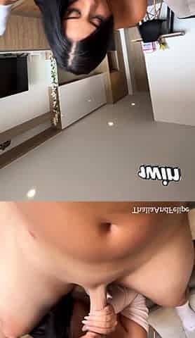 Sexy asian slut in fishnet stockings worhips her white man's cock with her mouth, then rides it with her tight ass