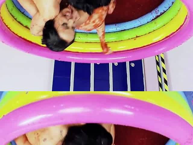 Brunette hair lesbos jump in a pool with food to wrestle and their large titties