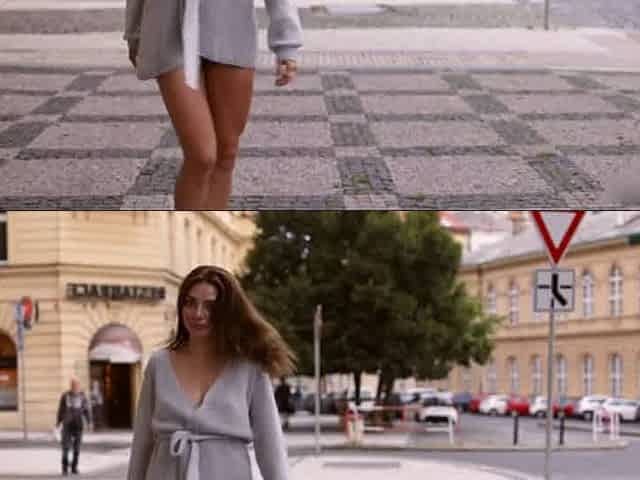 Public striptease by a pretty brunette.