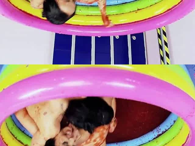 Brunette hair lesbian babes jump in a pool with food to wrestle and their large breasts