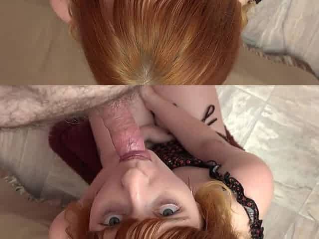 Pov of a redhead giving a blowjob and getting fucked doggy style