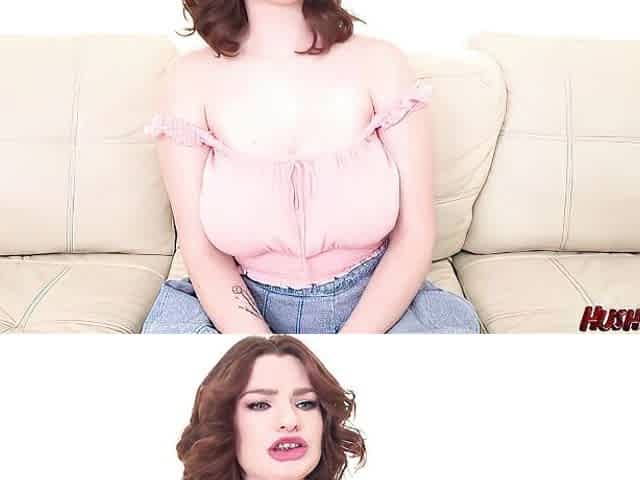 Pale redhead Mazy Myers moans while riding a cock on a sofa. HD