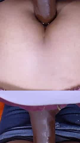 Constricted pink vagina filled with cum throughout pants