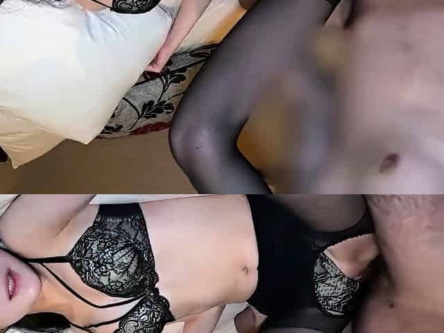Hot brunette in silver lingerie giving a deepthroat blowjob on the bed
